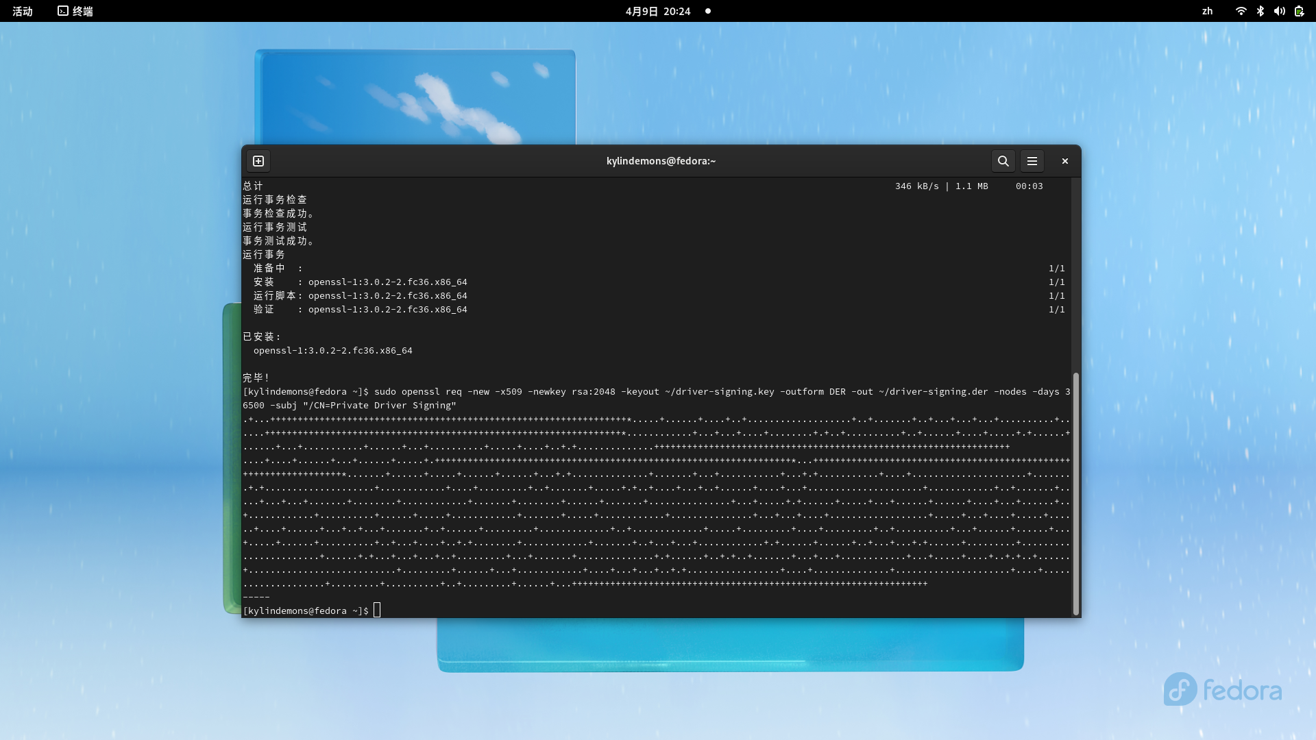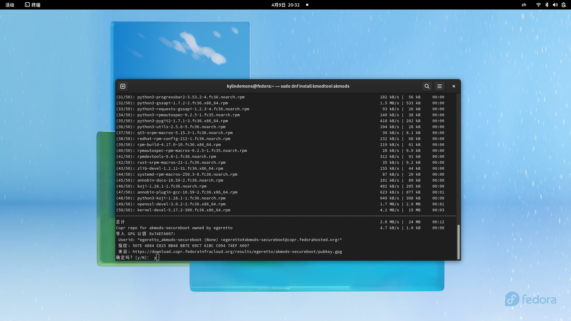 最新测试显示,本教程方法仅适用于Fedora 36 Beta及以下版本,Fedora 36正式版不再适用,官方支持通过特定工具一键生成安全启动密钥并导入,具体请参考这里